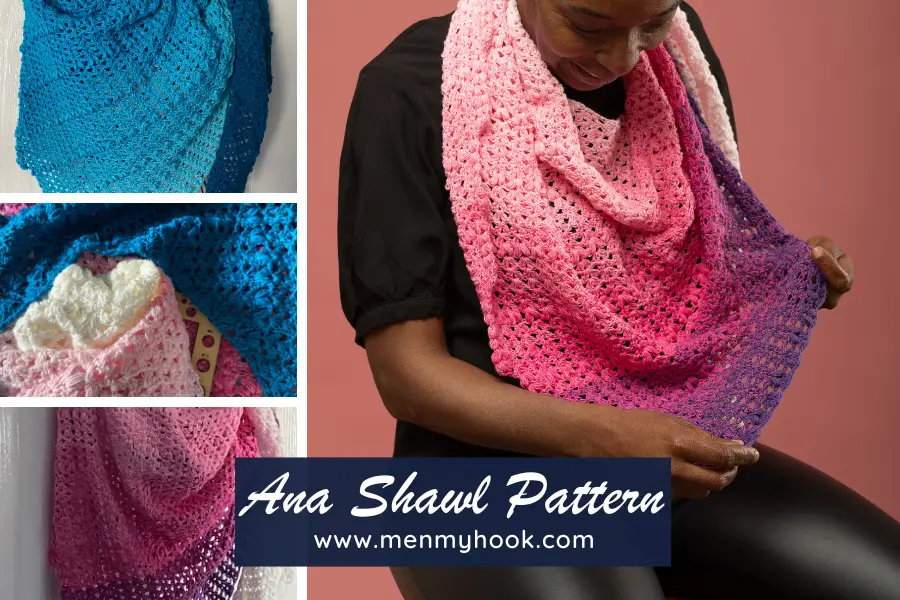 If you are familiar with the Ana Mae pattern this version will be a breeze. If you are new to this design, or a beginner crocheter, this is an easy kite shaped shawl design worked largely in chain spaces.